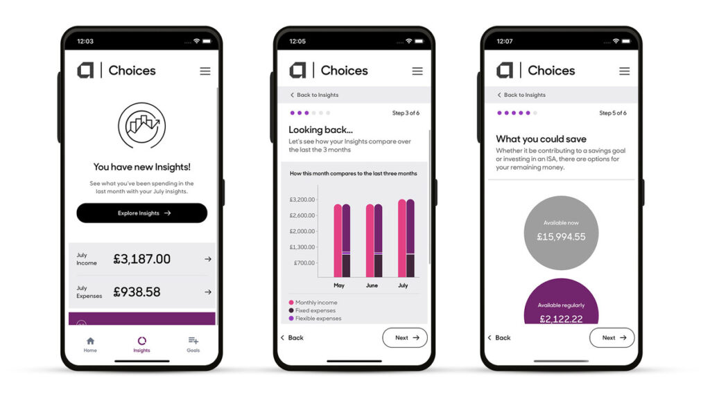From the customer perspective, Choices App analyses bank transactions and makes suggestions on how to accumulate savings more effectively. This is done through connecting with the client’s bank accounts in a secure way and extracting the necessary data. The app estimates the realistic amount that can be possibly saved and enables the client to orchestrate their saving priorities accordingly. It advises the client if it is better to save each month or come up with a one-off payment. It also identifies and gives notifications about any additional expenses that may have an impact on realising the saving plan.