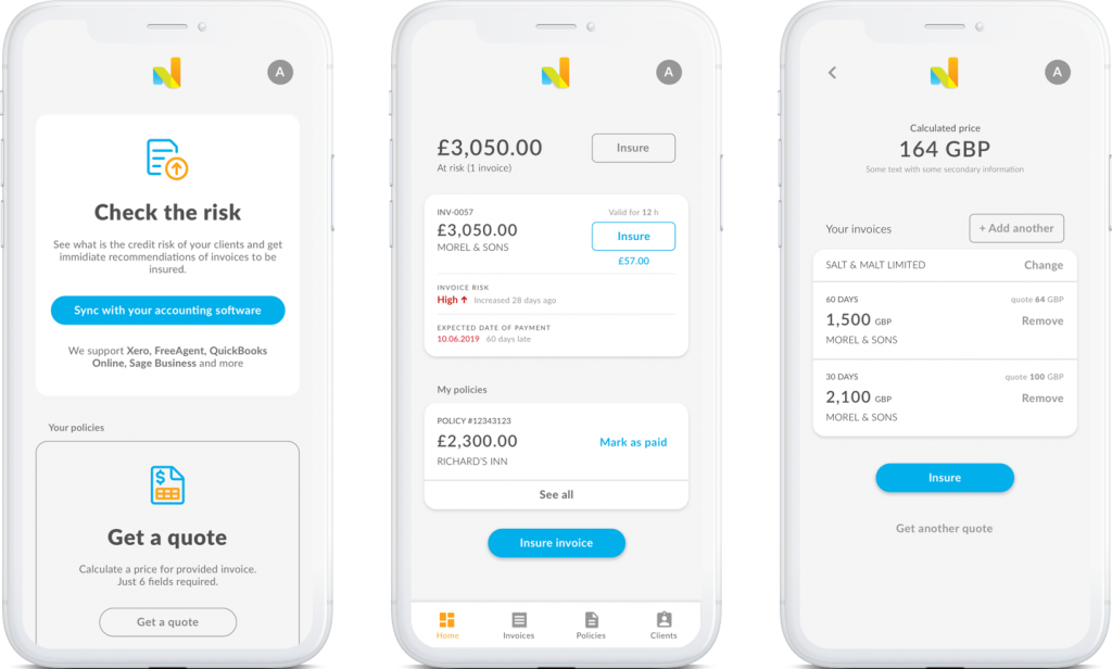 Initially, we worked on one part of Nimbla, which was a monitoring solution for codes and policies for invoices, making them all viewable and accessible in one place. For this stage, we delivered UI designs based on frameworks received from Nimbla. The first completed project encouraged the client to continue working with us on further challenges. We went on with the designs and started the development, which included: